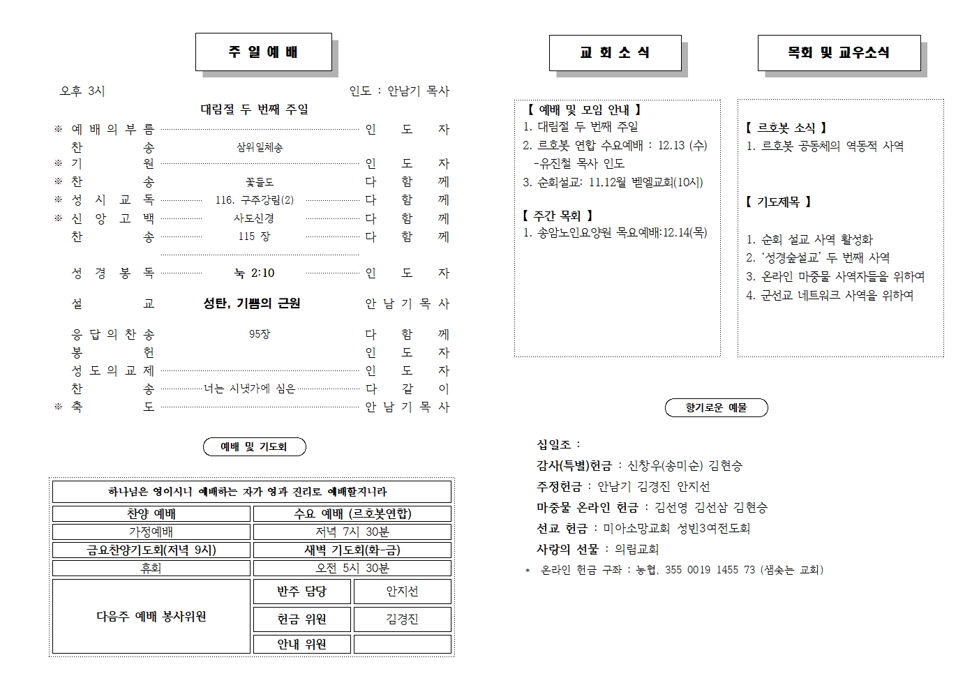 | 이전글 | 12월 17일 주보 (대림절 세 번째 주일) | 안남기 | 2023.12.17 | 0 | 261 |